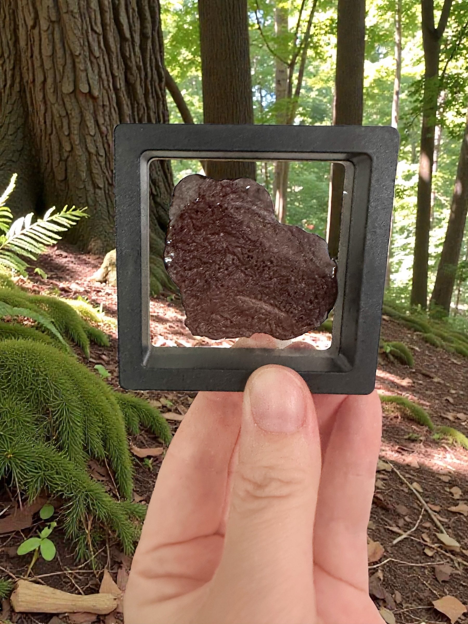 A museum-style Stegosaurus plate fragment replica, suspended in a floating display box and accompanied by a specimen identification tag.